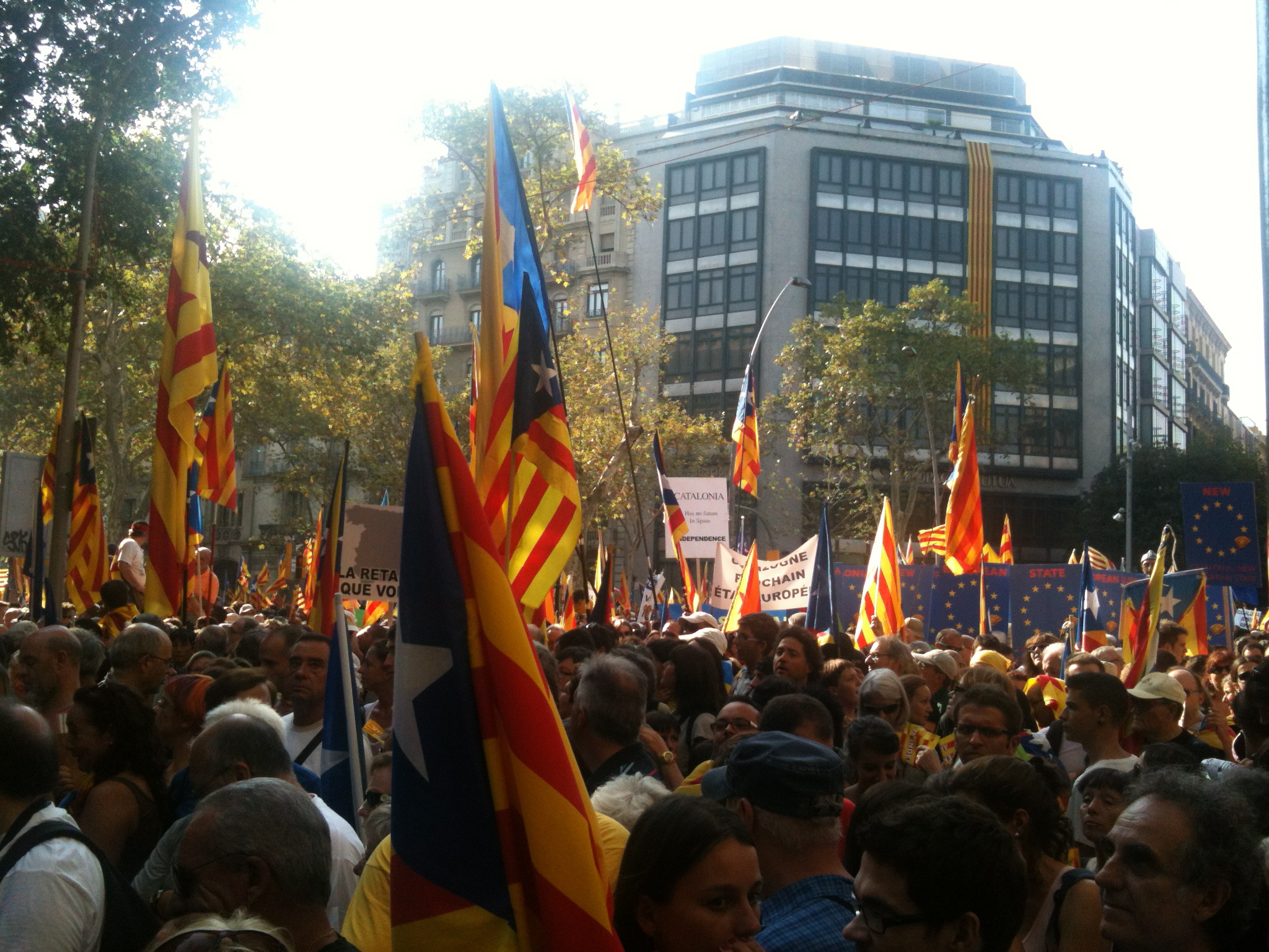 Els metros de les línies L1 i L2 anaven plens a vessar més d’una hora abans de l’hora de la convocatòria. Vaig arribar a tres quarts de cinc a l’estació de Passeig de Gràcia, a la cruïlla amb la Gran Via. Vaig mirar l’hora mentre pujava les escales cap el carrer i quan, cansat d’avançar molt dificultosament entre la multitud vaig arribar a la cruïlla amb Pau Claris ja era l’hora en punt tocada. Calculeu quanta gent hi havia. I no va ser només la riuada de gent que va baixar el Passeig de Gràcia. Els carrers del voltant estaven també plens de gom a gom. Costava trobar espais lliures, igual que costava trobar algú que no portés una estelada o un cartell reivindicatiu.
