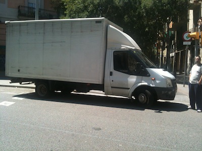El camió estava tranquilament estacionat al pas de vianants què comunica dos segments del carrer Rogent, tot creuant el carrer València, a Barcelona. I com podeu apreciar, el conductor encara era més tranquil.