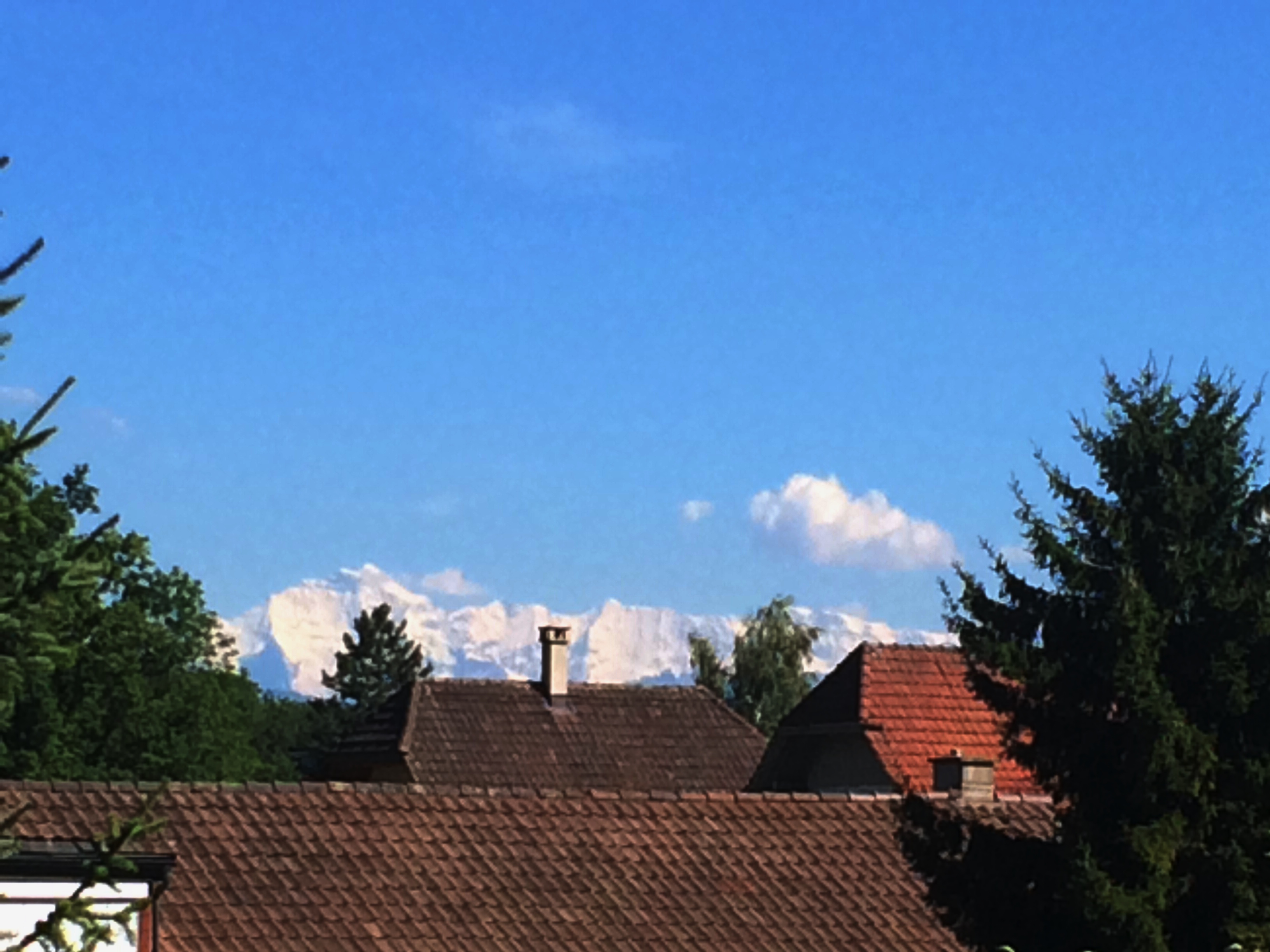 La foto és de començament d’agost, quan l’efecte de veure els cims nevats era encara més refrescant. La foto està presa des del poble, però des de Bern mateix (pels que la coneixeu, al davant del Casino) també es poden veure perfectament les muntanyes amb neu si la visibilitat acompanya.