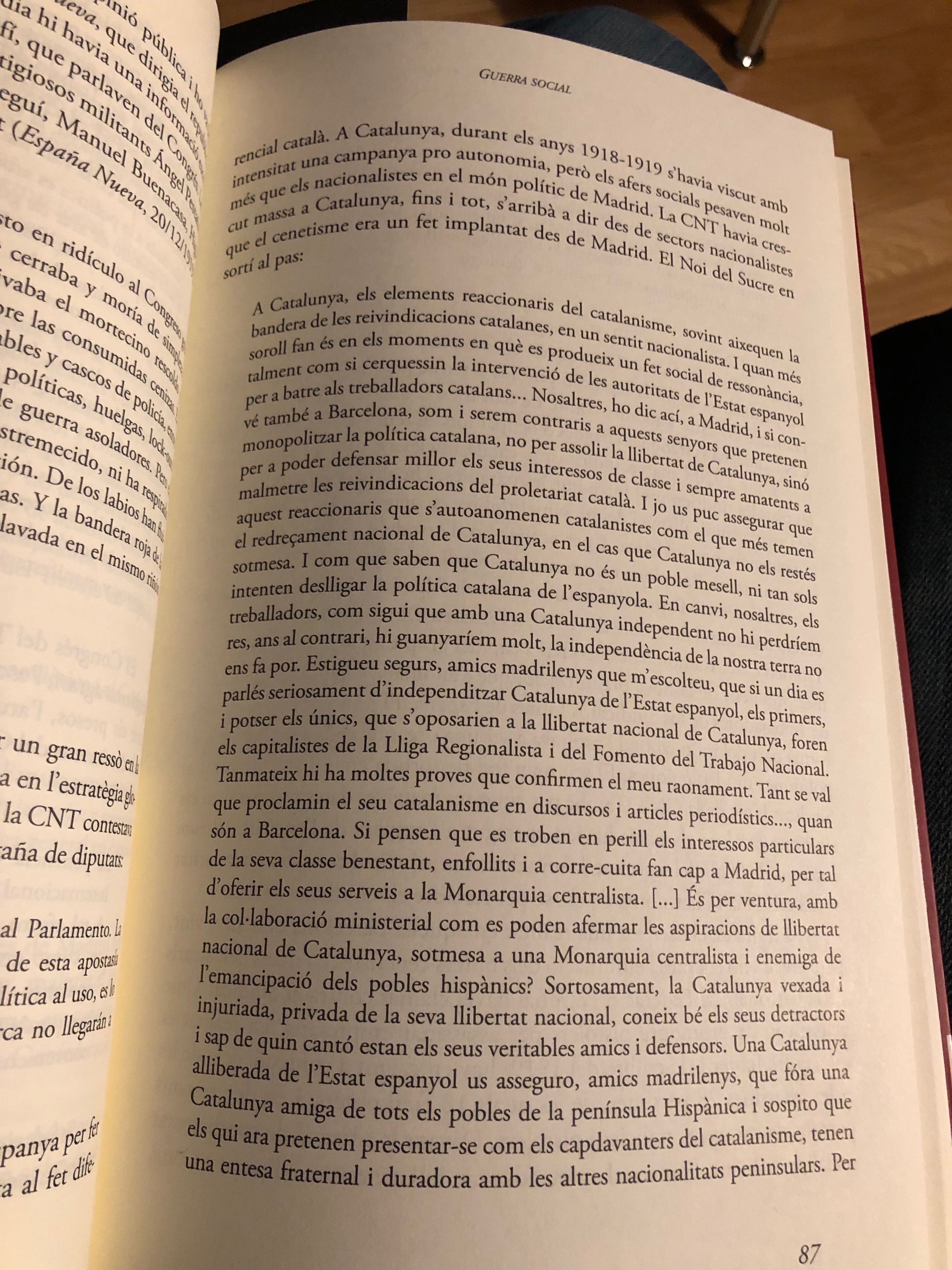 A la pàgina 87 l’autor cita un discurs a Madrid de Salvador Seguí, El noi del sucre, a les acaballes del 1919, quan després de la vaga de la Canadenca (que va portar la jornada laboral de vuit hores) la CNT va fer un congrés a Madrid i poc abans que la patronal endegués el pistolerisme. És a dir, unes circumstàncies força diferents de les actuals.